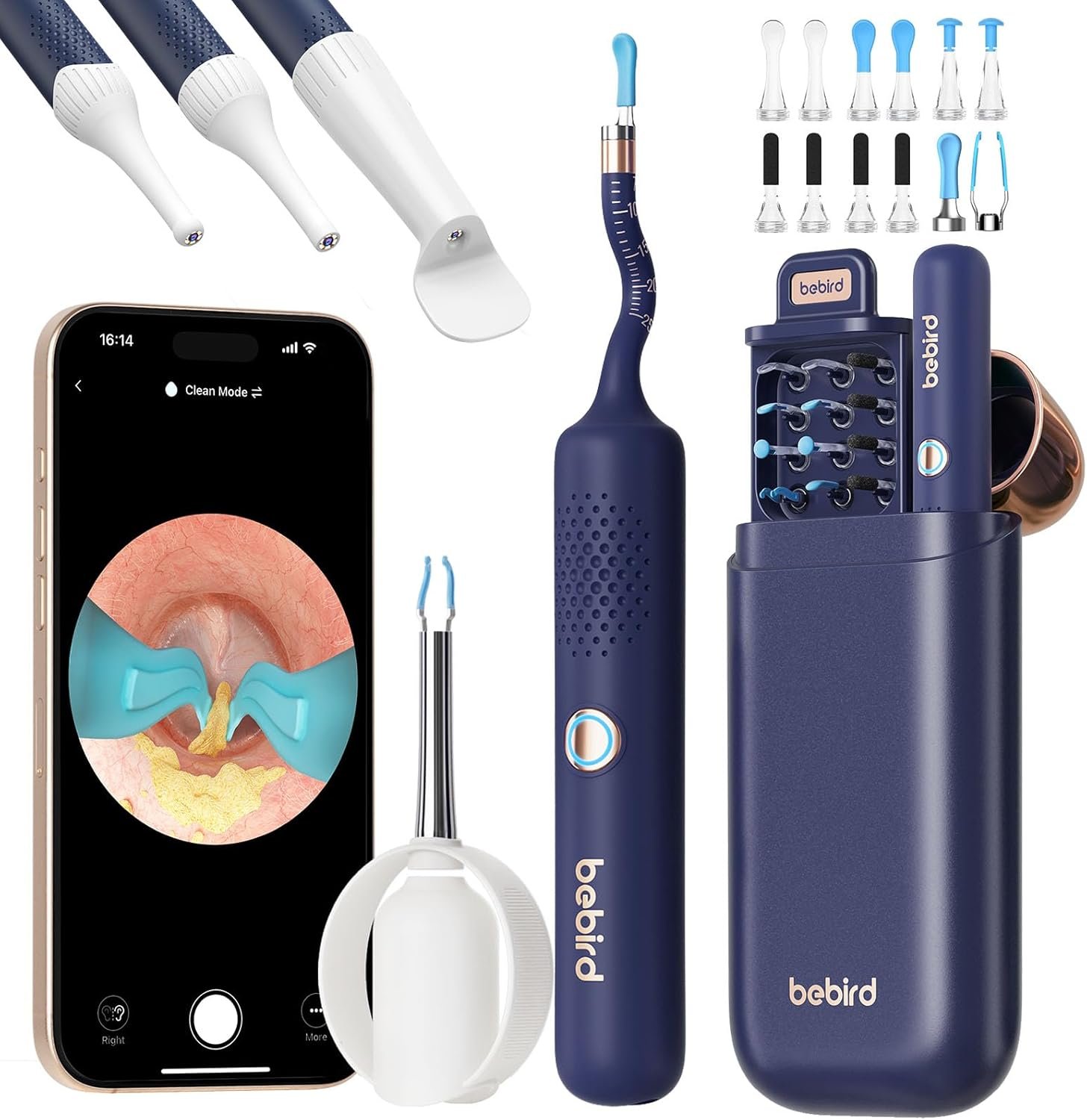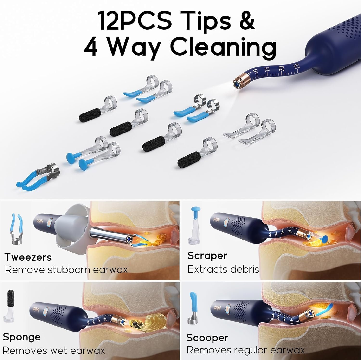 يشمل الجهاز 12 رأسا قابلا للتبديل، مصممة لتنظيف جميع أنواع شمع الأذن (الجاف والرطب). تتضمن هذه المجموعة ملاعق، ملاقط، أدوات كشط، وعصي أذن، مما يوفر حلا شاملا لجميع احتياجات تنظيف الأذن.